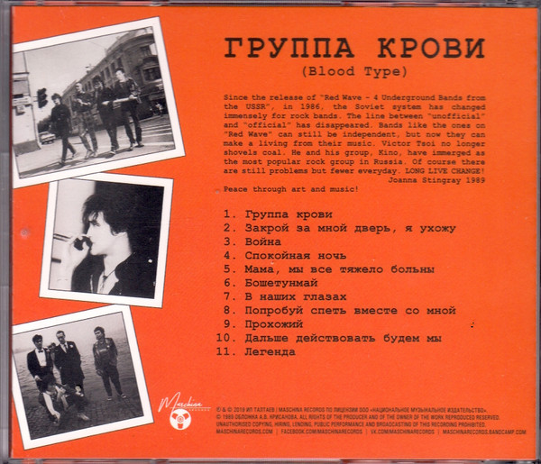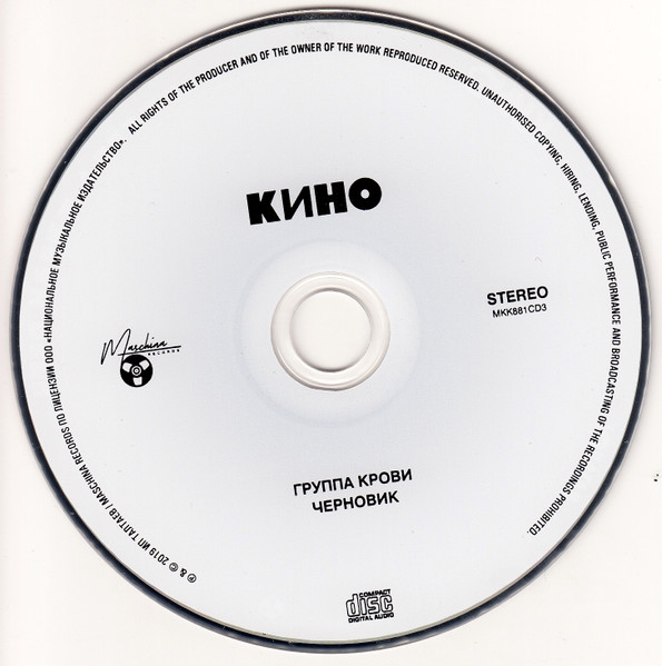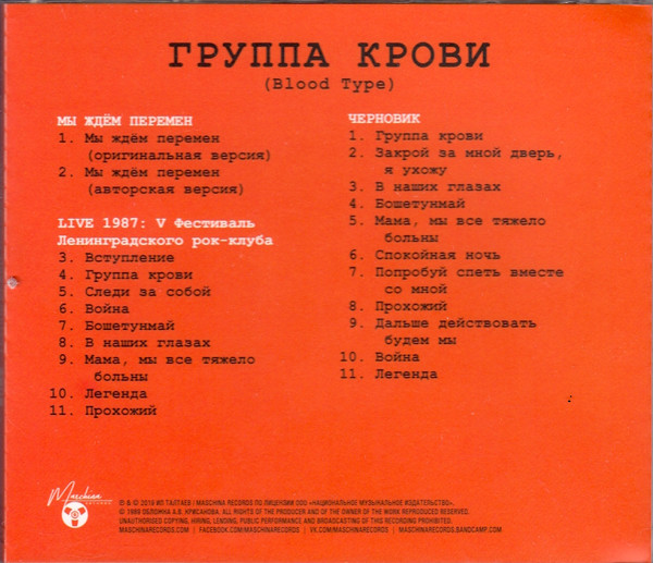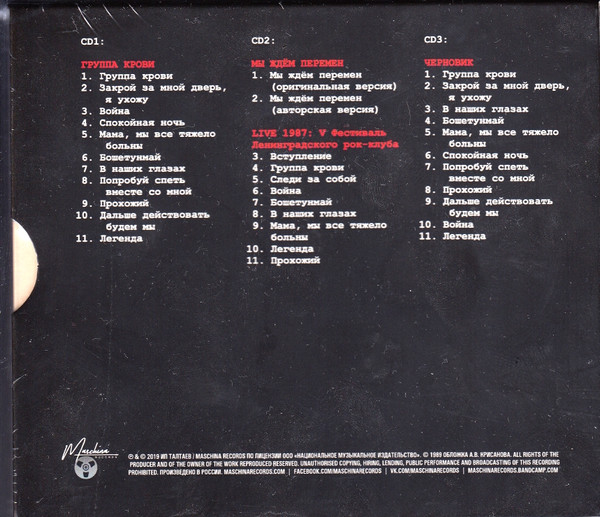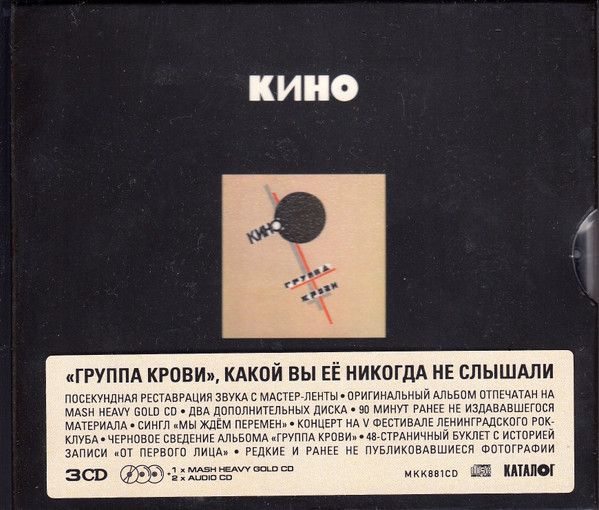 «Limited extended edition on three CDs. Includes remastered version of the album, non-album single «We are waiting for a change «, recording of a KINO concert performance at the V festival of the Leningrad rock club with the presentation of the «Blood Type» program and archival draft mixing of the album. Edition made in the form of two separate plastic boxes, equipped with a separate 48-page booklet and packed in a hard external slipcase».